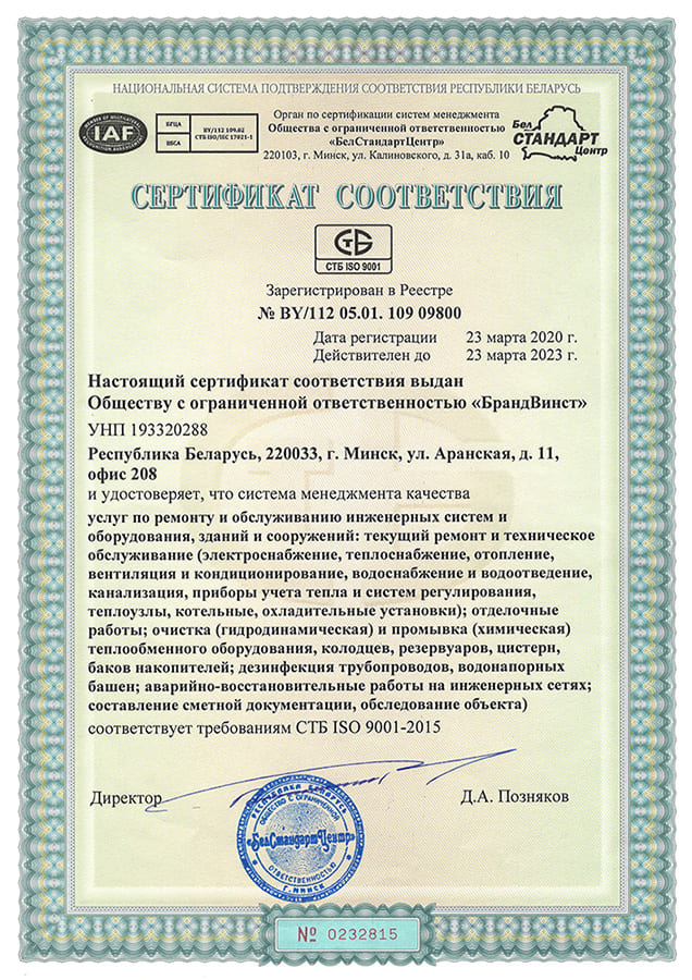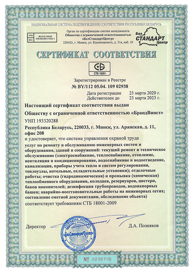 Сертификат соответствия ООО «БрандВинст» СТБ 18001-2009 Сертификат соответствия ООО «БрандВинст» СТБ ISO 9001-2015